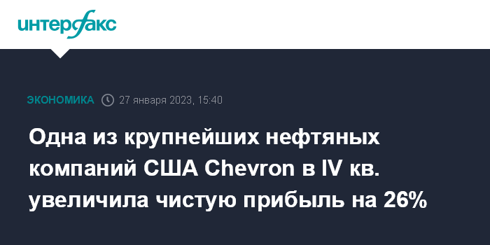 Одна из крупнейших нефтяных компаний США Chevron в IV кв. увеличила чистую прибыль на 26%