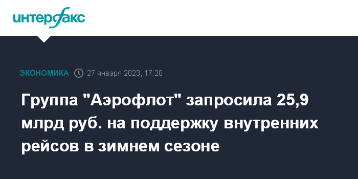 Москва. 27 января. INTERFAX.RU - Авиакомпании группы "Аэрофлот" запросили у Росавиации 25,9 млрд руб. на возмещение расходов при полетах внутри РФ в ноябре 2022 - марте 2023 года, следует из протокола вскрытия заявок на предоставление субсидий.