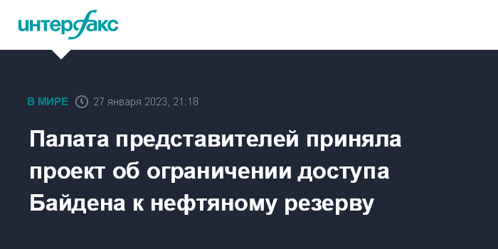 Москва. 27 января. INTERFAX.RU - Палата представителей США в пятницу одобрила предложенный республиканцами законопроект об ограничении полномочий президента по использованию нефтяного резерва страны.