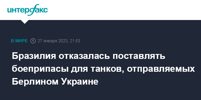 Москва. 27 января. INTERFAX.RU - Президент Бразилии Луис Инасиу Лула да Силва в пятницу отказал в поставках боеприпасов для танков Германии, которые могут в итоге оказаться на Украине. Об этом пишет бразильское издание Folha de S.Paulo ("Фолья ди Сан-Паулу").