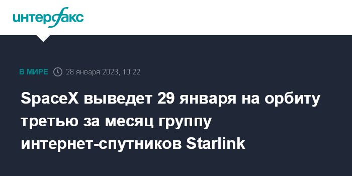 Москва. 28 января. INTERFAX.RU - Ракета-носитель Falcon 9 в воскресенье стартует на орбиту с очередной партией из 49 мини-спутников для пополнения орбитальной группировки глобальной сети интернет-покрытия системы Starlink, сообщила компания-разработчик SpaceX.