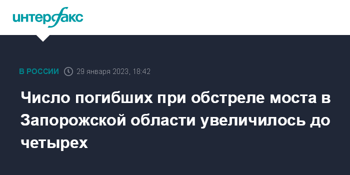 Москва. 29 января. INTERFAX.RU - Число жертв украинского ракетного удара по мосту через реку в Мелитопольском районе Запорожской области увеличилось до четырех, сообщил в воскресенье врио губернатора региона Евгений Балицкий.