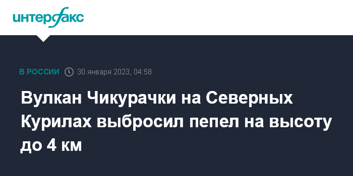 Москва. 30 января. INTERFAX.RU - Вулкан Чикурачки на курильском острове Парамушир (северные Курилы Сахалинской области) вновь активизировался - днем в понедельник на нем зарегистрирован пепловый выброс на высоту до 4 км, сообщается на сайте Камчатской группы реагирования на вулканические извержения (KVERT) Института вулканологии и сейсмологии ДВО РАН.