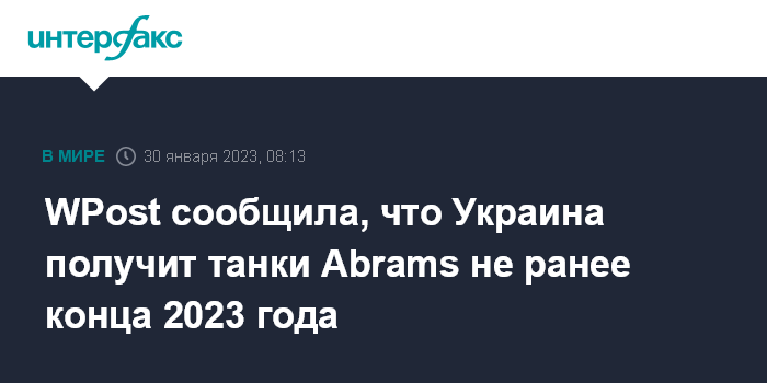 Москва. 30 января. INTERFAX.RU - США поставят Украине 31 танк Abrams не ранее конца 2023, пишет Washington Post.
