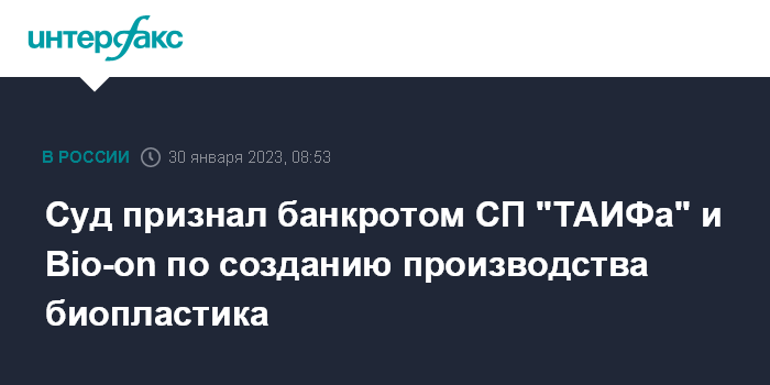 Москва. 30 января. INTERFAX.RU - Арбитражный суд Татарстана признал банкротом совместное предприятие группы "ТАИФ" и итальянской Bio-on - АО "2Био", основанное в 2018 году для создания в Татарстане производства биопластика по лицензии итальянской компании, говорится в материалах картотеки арбитражных дел.