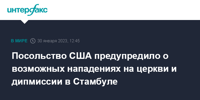 Москва. 30 января. INTERFAX.RU - Посольство США в Турции предупредило находящихся в стране американцев о возможных нападениях на церкви, синагоги и дипмиссии в Стамбуле.