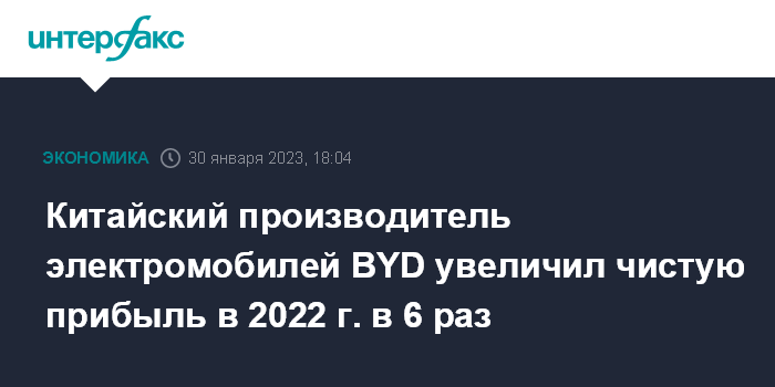 Китайский производитель электромобилей BYD увеличил чистую прибыль в 2022 г. в 6 раз