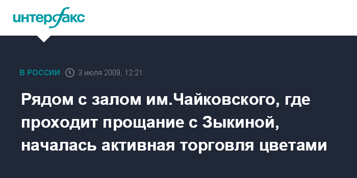 Москва. 3 июля. INTERFAX.RU – Церемония прощания с народной артисткой СССР, которая проходит сейчас в Москве в концертном зале им. Чайковского, стала возможностью заработать для торговцев цветами. Как передает с места событий корреспондент interfax.ru, рядом с местом, где люди ожидали начала церемонии, открылся пункт продажи цветов. Изначально стоимость четырех роз составляла 500 руб., однако позднее торговцы решили снизить цены и начали продавать розы по 80 руб. за штуку.
