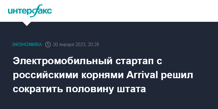 Москва. 30 января. INTERFAX.RU - Электромобильный стартап Arrival, основанный в Великобритании бывшим замглавы Минсвязи РФ Денисом Свердловым, решил сократить половину штата в рамках реструктуризации бизнеса. Гендиректором компании назначен бывший глава телеком-оператора "Скартел" (бренд Yota) Игорь Торгов.