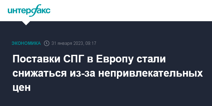 Москва. 30 января. INTERFAX.RU - Сравнительно низкие цены на газ в Европе, вызванные теплой погодой и высокой выработкой альтернативной энергетики, предсказуемо таят в себе опасность снижения привлекательности региона для поставщиков сжиженного природного газа.