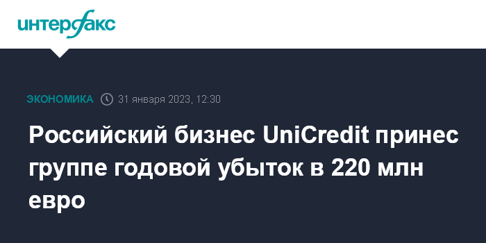 Москва. 31 января. INTERFAX.RU - В 2022 году российский бизнес итальянской UniCredit принес группе убыток в размере 220 млн евро против чистой прибыли в 218 млн евро годом ранее, говорится в материалах UniCredit.