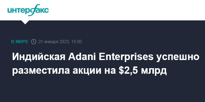 Москва. 31 января. INTERFAX.RU - Adani Enterprises Ltd, флагманская компания конгломерата индийского миллиардера Гаутама Адани, успешно разместила акции на $2,5 млрд, несмотря на недавнее появление доклада нью-йоркской Hindenburg Research, обвинившей Adani Group в "вопиющих" рыночных манипуляциях и мошенничестве с отчетностью, сообщает Bloomberg.