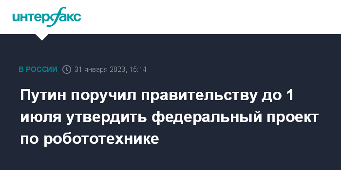 Москва. 31 января. INTERFAX.RU - Президент РФ Владимир Путин поручил правительству утвердить федеральный проект по развитию отечественной робототехники до 1 июля 2023 года.