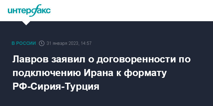 Москва. 31 января. INTERFAX.RU - Глава МИД РФ Сергей Лавров заявил о достижении принципиальной договоренности о подключении Ирана к трехстороннему формату Россия-Турция-Сирия.