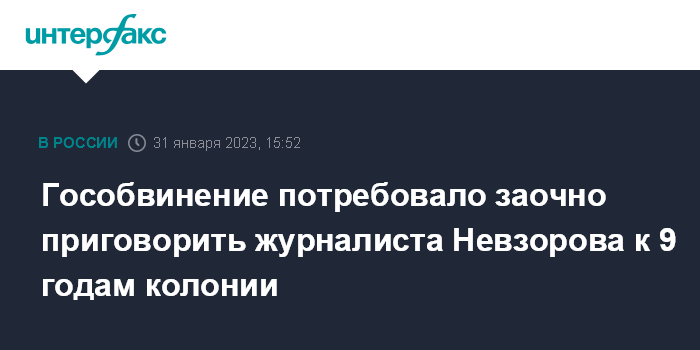 Москва. 31 января. INTERFAX.RU - Прокуратура в ходе прений попросила суд заочно назначить 9 лет колонии общего режима журналисту Александру Невзорову (признан в РФ иноагентом) по уголовному делу о распространении фейков про Вооруженные силы РФ, сообщили во вторник "Интерфаксу" в Басманном суде Москвы.