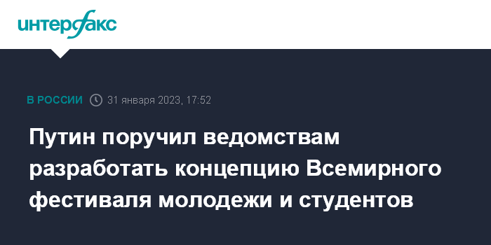 Москва. 31 января. INTERFAX.RU - Президент РФ Владимир Путин поручил до 15 февраля Росмолодежи совместно с Минпросвещения и Минобрнауки России разработать и представить концепцию проведения Всемирного фестиваля молодежи и студентов в 2023 году.