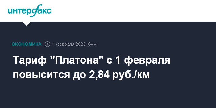 Москва. 1 февраля. INTERFAX.RU - Тариф госсистемы взимания платы с грузовиков массой более 12 тонн за проезд по федеральным автодорогам "Платон" с 1 февраля проиндексирован на 30 копеек: с 2,54 рублей до 2,84 рублей за 1 км пробега.