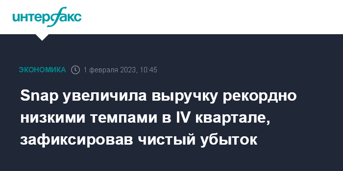 Москва. 1 февраля. INTERFAX.RU - Американская Snap Inc., владелец приложения Snapchat, увеличила выручку в четвертом квартале 2022 года на 0,1% - рекордно низкими темпами, и зафиксировала чистый убыток, в частности, из-за расходов на реструктуризацию.
