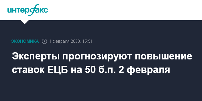 Москва. 1 февраля. INTERFAX.RU - Экономисты уверены, что ЕЦБ повысит ключевые процентные ставки на 50 базисных пунктов (б.п.) на заседании 2 февраля, до максимумов с 2008 года, и фокус их внимания уже смещается на следующую встречу совета управляющих, отмечает Bloomberg.