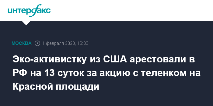 Москва. 1 февраля. INTERFAX.RU - Тверской суд Москвы назначил административный арест на 13 суток и штраф в 20 тыс. руб. гражданке США, активистке Алисии Дей за нарушения при проведении акции с "выгулом" теленка на Красной площади, сообщили "Интерфаксу" в суде в среду.