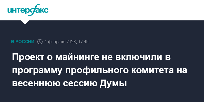 Москва. 1 февраля. INTERFAX.RU - Законопроект о легализации в РФ майнинга цифровых финансовых активов не был включен в программу законопроектной работы комитета по финансовому рынку Госдумы в период весенней сессии 2023 г., (должна завершиться 28 июля), следует из информации о ходе законопроектной работы комитетов, обновленной в среду.