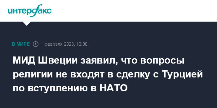 Москва. 1 февраля. INTERFAX.RU - Религия и связанные с ней вопросы не являются частью меморандума между Турцией, Швецией и Финляндией о вступлении в НАТО, заявил глава МИД Швеции Тобиас Биллстрем. Его слова в среду приводит Associated Press.