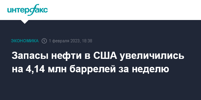 Москва. 1 февраля. INTERFAX.RU - Коммерческие запасы нефти в США на прошлой неделе увеличились на 4,14 млн баррелей - до 452,69 млн баррелей, сообщило Министерство энергетики страны.