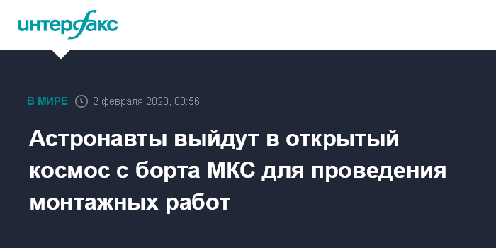 Москва. 2 февраля. INTERFAX.RU - Двое астронавтов выйдут в открытый космос с борта Международной космической станции (МКС) в четверг для проведения на ее поверхности монтажных работ в целях модернизации системы энергоснабжения, сообщило Национальное управление США по аэронавтике и исследованию космического пространства (NASA).
