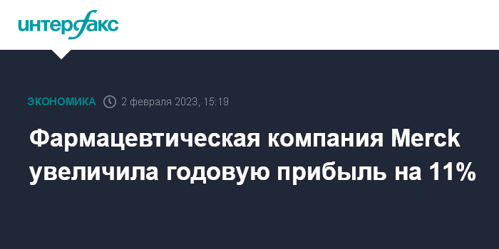 Москва. 2 февраля. INTERFAX.RU - Американская фармацевтическая компания Merck & Co. в 2022 году увеличила чистую прибыль на 11%, до $14,52 млрд, прибыль без учета разовых факторов выросла на 39%, до $7,48 на акцию. Годовая выручка компании повысилась на 22%, до $59,3 млрд.