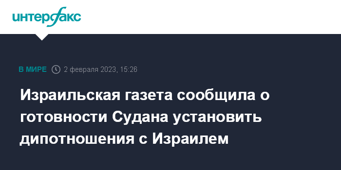 Москва. 2 февраля. INTERFAX.RU - Судан вслед за рядом других исламских стран решил присоединиться к так называемым "соглашениям Авраама" об установлении дипломатических отношений с Израилем, сообщила газета The Times of Israel со ссылкой на неназванного израильского официального лица.