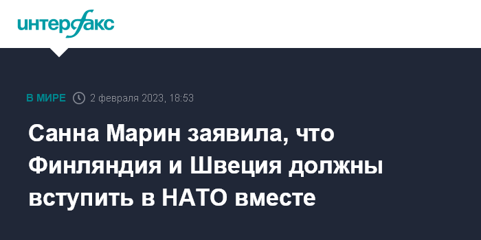 Москва. 2 февраля. INTERFAX.RU - Финляндия и Швеция должны вступить в НАТО вместе, заявила премьер-министр Финляндии Санна Марин.