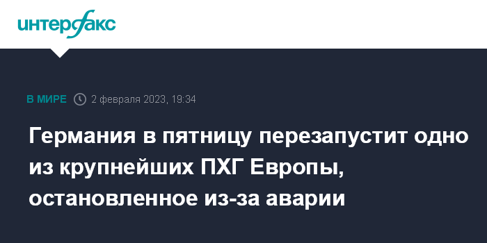 Москва. 2 февраля. INTERFAX.RU - Одно из крупнейших подземных хранилищ газа (ПХГ) Европы "Реден", остановленное во вторник, будет запущено в работу утром в пятницу, сообщает оператор объекта компания Astora.