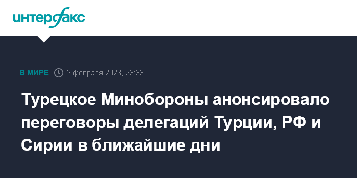 Москва. 2 февраля. INTERFAX.RU - Делегации оборонных ведомств Турции, России и Сирии в ближайшее время проведут переговоры на техническом уровне в продолжение прошедших в декабре переговоров в Москве, заявил в четверг турецкий министр обороны Хулуси Акар.