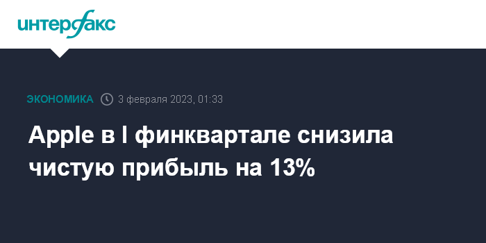 Москва. 3 февраля. INTERFAX.RU - Apple Inc. в первом квартале 2023 финансового года сократила чистую прибыль на 13,4% и выручку - на 5,5%, при этом оба показателя не оправдали прогнозов экспертов.