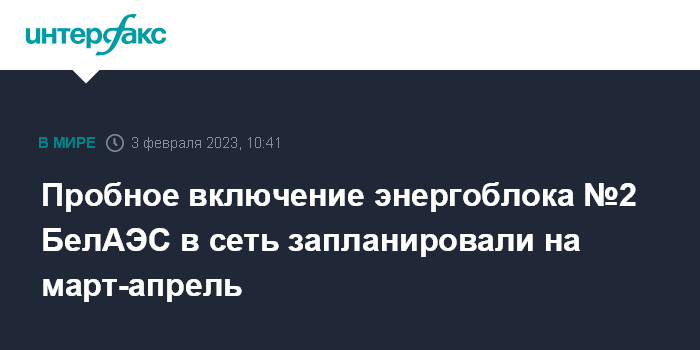В декабре 2022 года министр энергетики республики Виктор Каранкевич сообщал, что энергетический пуск (предшествует этапу опытно-промышленной эксплуатации, за которым, в свою очередь, следует ввод в промышленную эксплуатацию - ИФ) второго энергоблока БелАЭС, который предусматривает его подключение к энергосистеме Белоруссии, запланирован в первом квартале 2023 года.