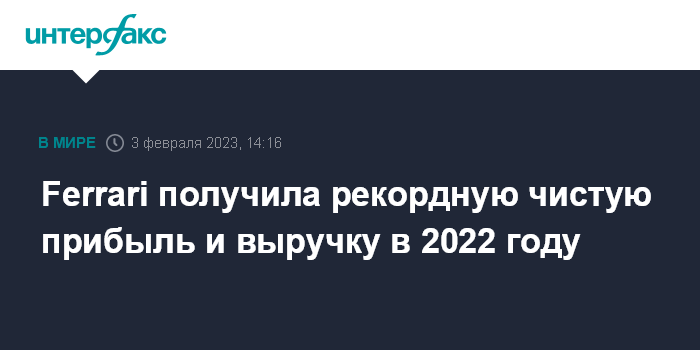 Москва. 3 февраля. INTERFAX.RU - Итальянский производитель спортивных автомобилей Ferrari NV в 2022 году увеличил чистую прибыль на 13% и зафиксировал 19%-й рост выручки, причем оба показателя оказались рекордными в истории компании.