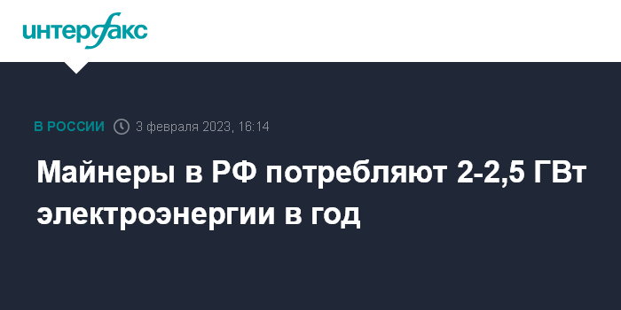 Москва. 3 февраля. INTERFAX.RU - Российские майнинг-фермы потребляют от 2 до 2,5 ГВт электроэнергии в год, китайские майнеры остаются лидерами в мире по объему энергопотребления. Об этом сообщил вице-президент Российской ассоциации криптоиндустрии и блокчейна (РАКИБ) по электрогенерации Дмитрий Ступин в пятницу.