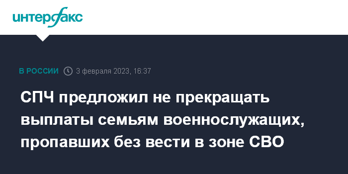 Москва. 3 февраля. INTERFAX.RU - Совет при президенте РФ по развитию гражданского общества и правам человека направит в правительство предложение не прекращать положенные выплаты семьям участвующих в специальной военной операции военнослужащих в случае их пропажи без вести, сообщила в пятницу пресс-служба СПЧ.