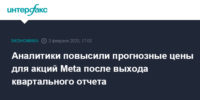 Москва. 3 февраля. INTERFAX.RU - Аналитики ряда инвесткомпаний и банков повысили прогнозные цены для акций Meta Platforms (признана в РФ экстремистской организацией и запрещена) после выхода квартальной отчетности компании.
