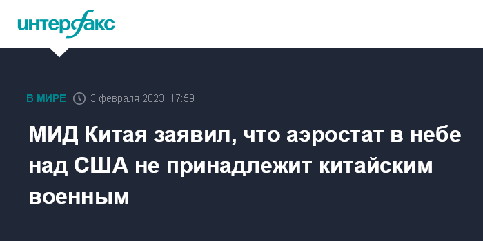 Москва. 3 февраля. INTERFAX.RU - Замеченный над США аэростат, который в Вашингтоне назвали китайским разведывательным зондом, оказался "гражданским воздушным судном", которое сбилось с курса, заявили в китайском МИД в пятницу.