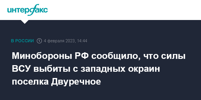 Москва. 4 февраля. INTERFAX.RU - Российские военные выбили украинских военнослужащих с западных окраин поселка Двуречное в Харьковской области, заявил официальный представитель Минобороны РФ Игорь Конашенков.