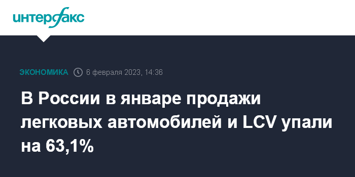 Москва. 6 февраля. INTERFAX.RU - В январе 2023 года в России продажи легковых автомобилей и LCV упали на 63,1% в годовом измерении, до 32,5 тысячи единиц, сообщила Ассоциация европейского бизнеса.