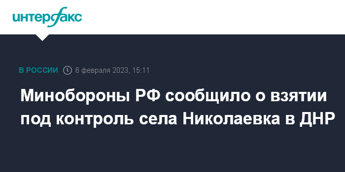 Москва. 6 февраля. INTERFAX.RU - Российские военные взяли под контроль село Николаевка Донецкой народной республики (ДНР), заявил официальный представитель Минобороны РФ Игорь Конашенков.