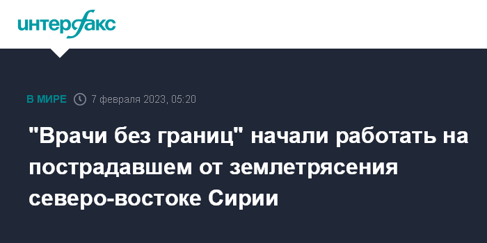 Москва. 7 февраля. INTERFAX.RU - Медицинская организация "Врачи без границ" (MSF) в сотрудничестве с местными партнерами круглосуточно оказывает помощь людям на северо-западе Сирии, пострадавшем в результате мощного землетрясения в соседней Турции, передает телеканал CNN.