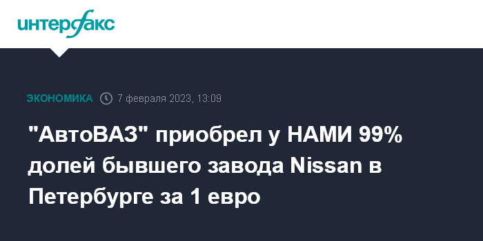 Москва. 7 февраля. INTERFAX.RU - "АвтоВАЗ" закрыл сделку по приобретению 99% долей бывшего петербургского завода Nissan (ООО "Ниссан Мэнуфэкчуринг Рус") у подведомственного Минпромторгу ФГУП "НАМИ", которому японский концерн передал свои активы, уходя из России.