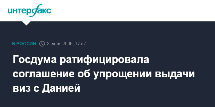 Москва. 3 июля. INTERFAX.RU - Госдума в пятницу ратифицировала межправительственное соглашение с Данией об упрощении выдачи виз гражданам РФ и Королевства Дания.