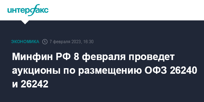 Минфин РФ 8 февраля проведет аукционы по размещению ОФЗ 26240 и 26242