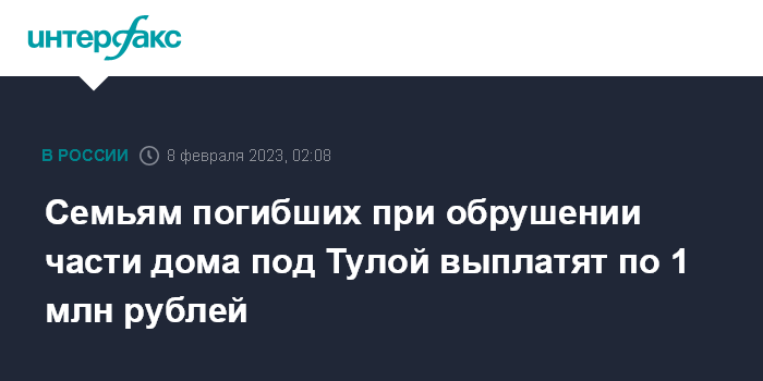 Семьям погибших при обрушении части дома под Тулой выплатят по 1 млн рублей