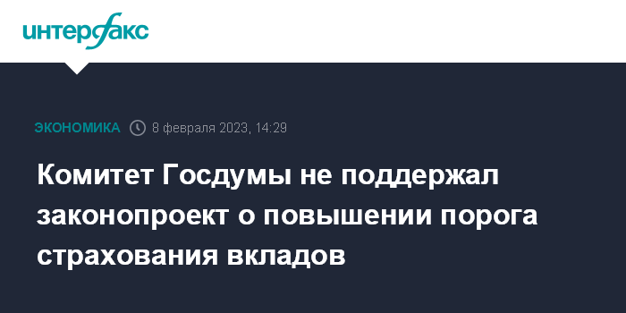 Москва. 8 февраля. INTERFAX.RU - Комитет Госдумы по финансовому рынку на заседании в среду рекомендовал парламенту отклонить законопроект о повышении порога страхования вкладов в России с 1,4 млн рублей до 3 млн рублей.