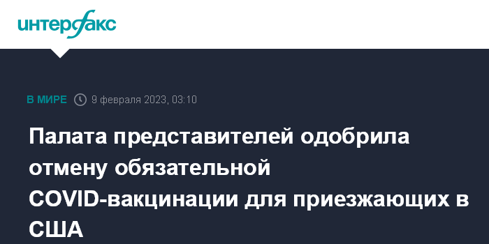 Москва. 9 февраля. INTERFAX.RU - Законопроект, отменяющий требование об обязательной вакцинации от COVID-19 въезжающих в страну иностранцев, был принят Палатой представителей США в среду.